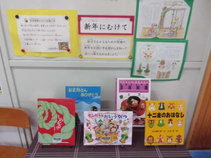 師走に入り、あっという間に今年も残り少なりました。学校図書館前の本の紹介は、もう新年の準備に変わっていました。