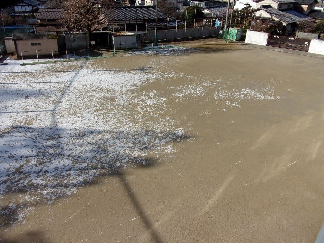 1月最後の授業日。運動場一面真っ白の朝でしたが、日差しととも地面が見えてきました。