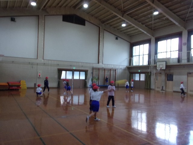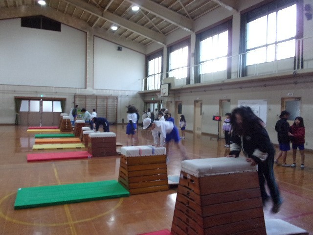 寒い中でも、体育の授業に4年、1年が取り組んでいます。とび箱では、いきなり飛ぶのでなく、準備運動からスタートです。