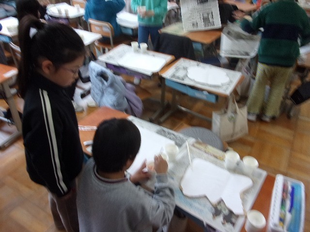 2年生は、作品づくりで色付けに入ります。混ぜながらどんな色になるのか楽しみです。