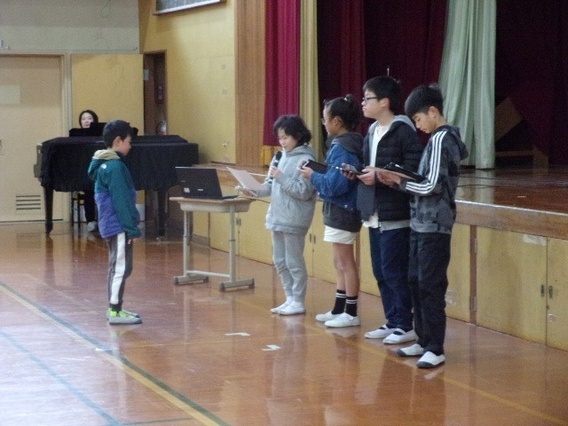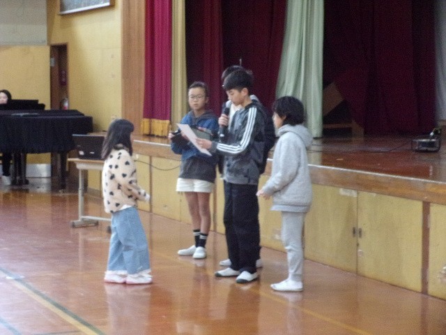 給食委員会から給食週間の取り組みの表彰があり、1年生と3年生が賞状を受け取りました。