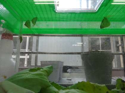 今朝,教室に来てモンシロチョウのサナギが入った水槽を見ると,3匹成虫にかえっていました。これで,卵から合計5匹成虫にかえりました。