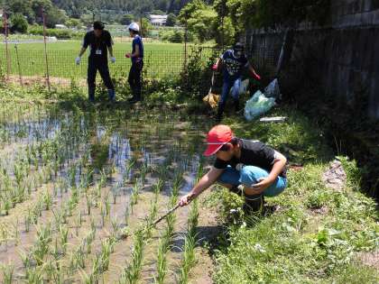 田んぼの水が少なくなったので,用水路から水を流し込みました。毎朝,水の量を確認するなど,水の管理に慣れてきた様子です。