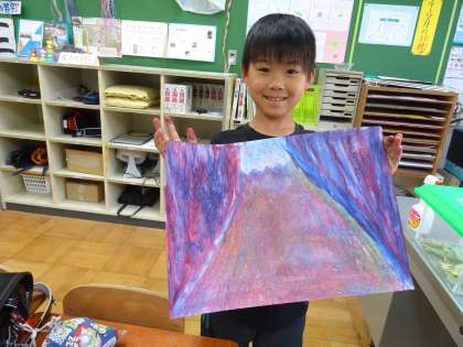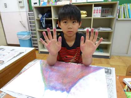 今日の図工では,富士山の絵を描いていました。色づかいがとてもきれいで,いつも感心しています。でも,手のひらは・・・。