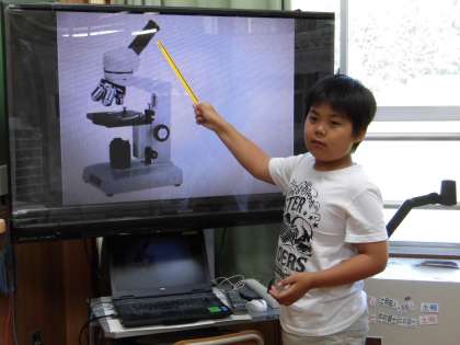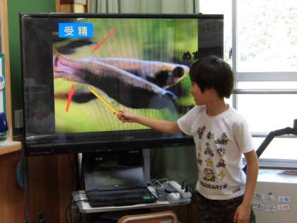 今日は,スライドショーを使って,「メダカのたんじょう」の学習内容をふり返りました。今回の授業では,大事なポイントを解説する役目を児童に任せました。今までに習ったことを思い出したり,教科書で確認したりしながら,見事,大役を果たしていました。