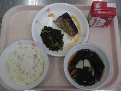 麦ごはん 牛乳 さばのかわり煮 だいこん葉のごまいため すまし汁
