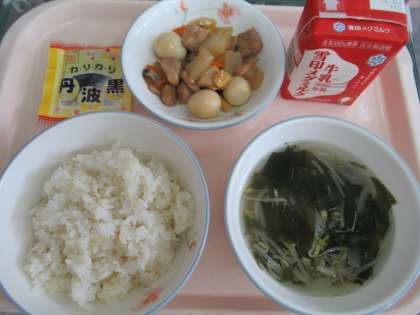 麦ごはん 牛乳 プリプリ中華いため わかめスープ 黒大豆