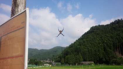 子どもたちの朝の集団登校場所に向かう途中のバス停で見つけました。台風3号が来る前の様子です。濃い雲の中を蜘蛛が歩いているようです。そして、今朝は、青空にぽっかり蜘蛛が浮かんでいます。蜘蛛の巣は、大雨にもしっかり耐えられるんですね。