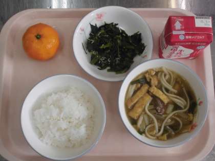 減量ごはん 牛乳 カレーうどん ほうれん草とじゃこのいためもの みかん