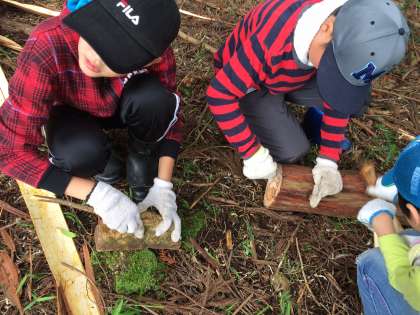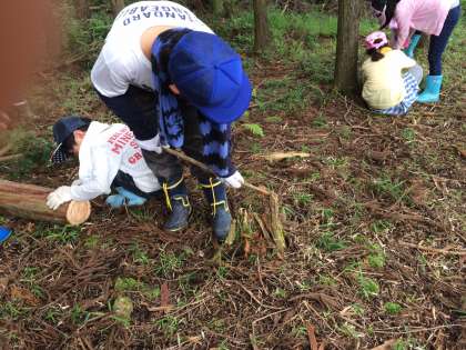 子どもたちは,それぞれに工夫して木の枝を尖らせて,自分で皮を剥く道具を作っていました。