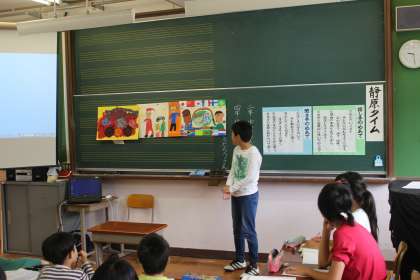 静原タイムの発表がありました。サッカーが得意ということはみんなよく知っていましたが,絵を描くことが好きということは初めて知った子も多かったようです。昔から書きためてきた絵を資料にして発表しました。