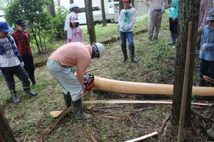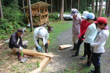 間伐体験をしました。6年生は自分で育てている田の名前を間伐材の立て看板に書きたいと考えました。そこで,地域の方に間伐材をななめ切りしてもらい,表面をカンナで削って表面を滑らかにしていただきました。削っていくうちにツヤがでてきれいになっていくにつれ,子どもたちもうれしそうにしていました。