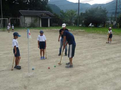 今日のチャレンジ学習は『グランドゴルフ』で,6名の児童の参加がありました。とても蒸し暑く,時々小雨もパラパラ降ってきましたが,楽しそうな歓声がたくさんあがっていました。地域の方のご協力もあり,楽しい時間を過ごすことができました。