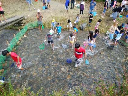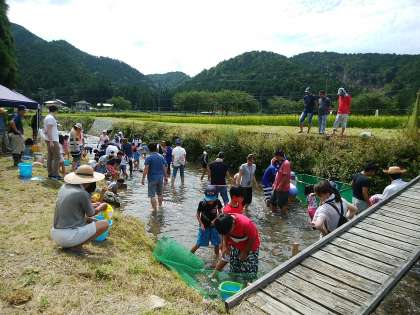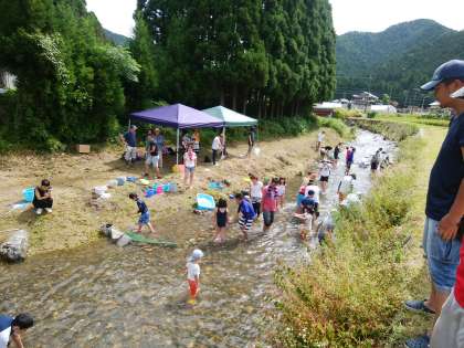 8月20日は静原夏祭りの日です。午前中は恒例の魚つかみ大会です。大人も子どももいっしょに川に入り、鱒や金魚を追いかけました。