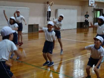 中心は団体演技。リズムに乗って,全員がどんどん上手になっています。
