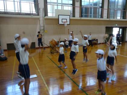 団体演技では,組体操の練習をしました。2人組から6人組までやりましたが,まだまだうまくいきません。その後は,応援練習をしました。みんなが振付けをほとんど覚えました。