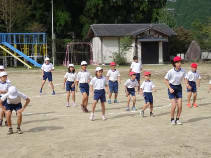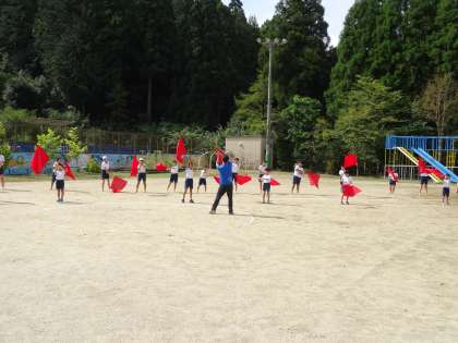 今日の1・2時間目は全校体育でした。昨日の雨が嘘のように晴れて,暑い中,準備運動をしてから,団体演技やリレーの練習などをしました。