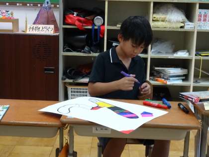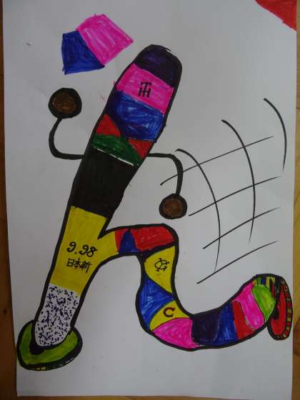 運動会のスローガンの字を書きました。3年生の担当の字は『ん』です。太い字にして黒色のマジックで縁取りをし,その中をいろいろな色を塗っていきました。『ん』の字を見ていると,何か人が走っているように見えたので,『ん』の字に靴を履かせ,手も付けてみました。出来上がりがこれです。