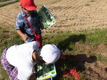 某テレビ番組のごとく,静原を散策しました。「総合的な学習の時間」としての活動ですが,理科で学習した「花と実や種子」の学習材料もたくさん見つけました。種類はちがっても,花には「おしべ」「めしべ」があることを確認したり,「めしべ」の下部がふくらみつつある花を見つけては「実ができそう」とつぶやいたり,楽しい散策となりました。