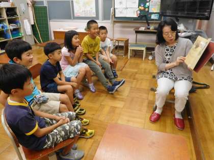 地域の方や学校司書の先生に読み聞かせをしていただきました。図書館にある絵本を読んでくださいましたが、手に取って読んでいない本もまだまだありますね。