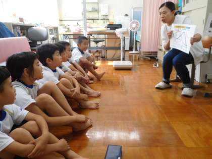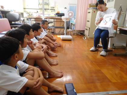 身体計測の前に保健指導をしていただきました。運動の大切さについてです。今の時期にしておくとよい9つの魔法の動作も教えていただきました。