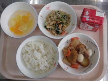 麦ごはん 牛乳 平天とこんにゃくの煮つけ もやしの煮びたし フルーツ寒天