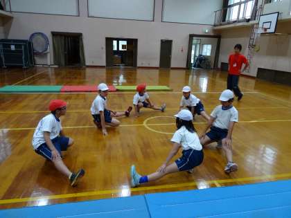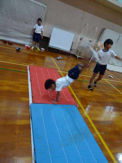 準備運動をしっかりし,前転を素早く回る子,倒立をする子,ロンダードの練習をする子,側転の練習をする子,それぞれの目あてを持って練習していました。