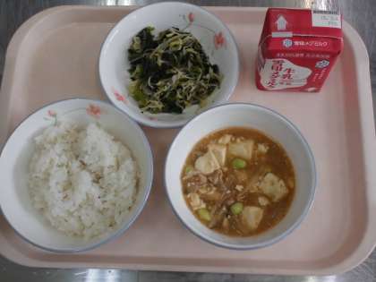 麦ごはん 牛乳 とうふの四川風 ほうれん草ともやしのいためナムル