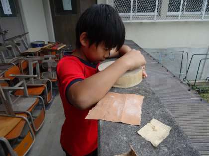 でっかいコマを作るようで,自然の木を紙やすりで必死に磨いていました。