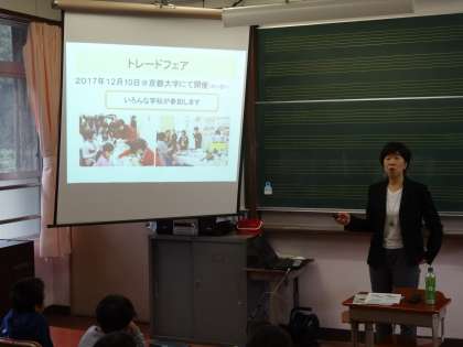 アントレ学習でお世話になっている原田先生が来校され,12月10日に開かれる『京大トレードフェア』の説明を聞きました。