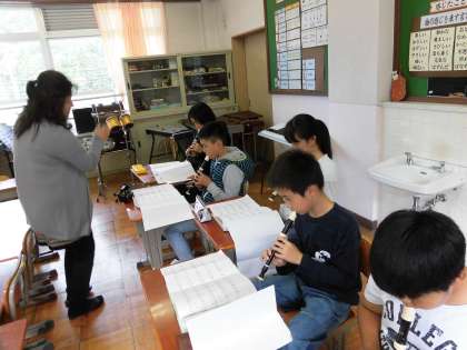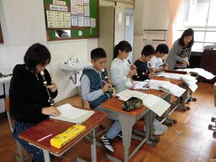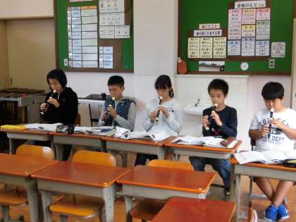 楽しい音楽の時間。歌声をそろえる,リズムを合わせて演奏する…など,友達を意識して活動しています。とても素敵な姿が見られる時間です。