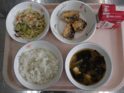 麦ごはん 牛乳 とびうおのこはくあげ ごま酢煮 なめこのみそ汁