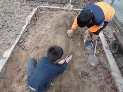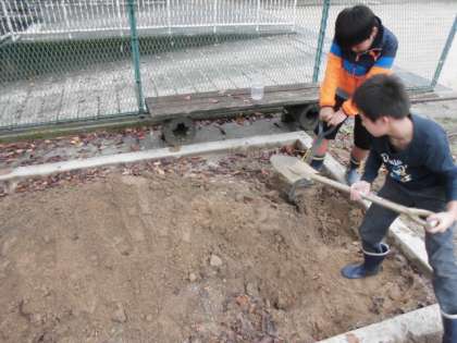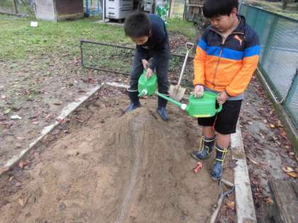 「流れる水は,土砂を運んだりけずったりするはたらきがあるのか実験で調べよう」というめあてに向かい学習しました。そのために砂場に山をつくり,水の通り道をつくって水を流すことで川の流れを再現しました。結果,「流れる水は,土を運ぶはたらきがある」こと,「流れる水は土をけずるはたらきがある」ことがわかりました。この学習を日常に目を向け,自然での現象からも確かめてほしいなと思います。