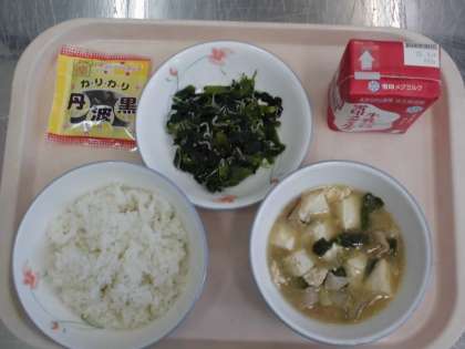 麦ごはん 牛乳 豚肉ととうふのくず煮 ほうれん草とじゃこのいためもの 黒大豆
