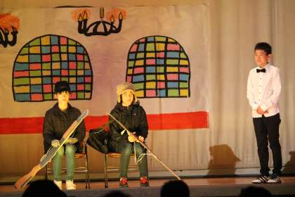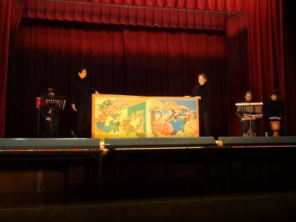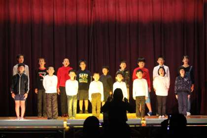 学校運営協議会 読書活動部会による読み聞かせ「ごちそうの木」、6年劇「注文の多い料理店」、全校合唱「未知という名の船に乗り」