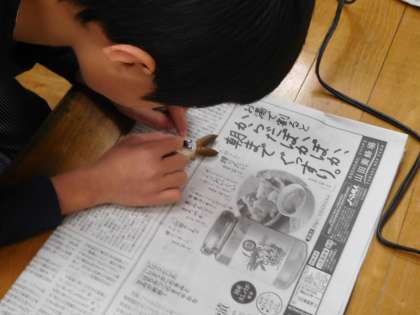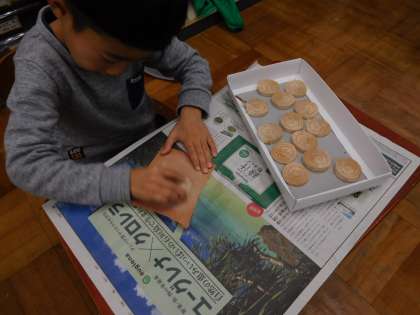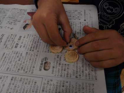 12月10日のトレードフェアに向けて商品づくりをしています。木の枝を薄く切って,木の実や種をつけてかわいらしい動物の磁石を作っています。