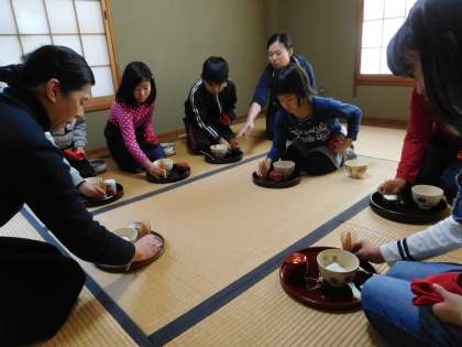 地域の方が来て、教えてくださいました。今日で四回目のお稽古です。少しずつ袱紗のたたみ方にも慣れてきました。