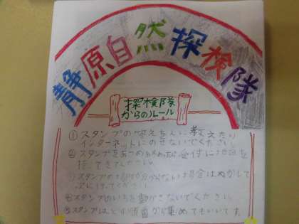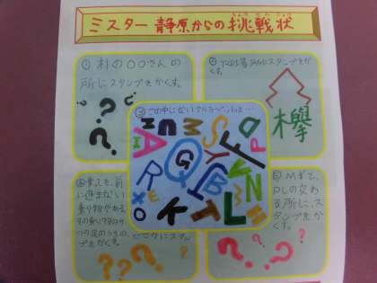 ついに,この日がやってきました。5年生主催のイベント,「静原自然探検隊」を行う日です。イベント内容は,クイズを解いてスタンプの置き場所を見つけ,スタンプをそろえていくクイズ・ラリー形式です。1枚目の写真がクイズで,このクイズを解くカギが2枚目のマップ内にかくされています。