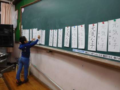 少し早いですが、書初め作品です。書いては比べ、よい作品のみを黒板に残していきました。45分間、しっかり集中して自分の字と向き合うことができました。