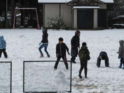 雪が5〜10cmほどグラウンドに積もって,今日の朝休み・中間休みは雪合戦に励んでいました。靴下も,手袋もぐちゃぐちゃにぬれました。