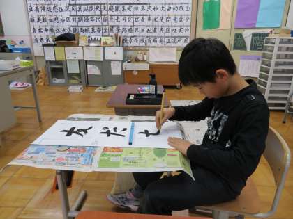 昨日から書初め展が始まっています。『正月』という字は掲示しましたが,画仙紙に書く『友だち』がまだできていなかったので,2校時に行いました。
