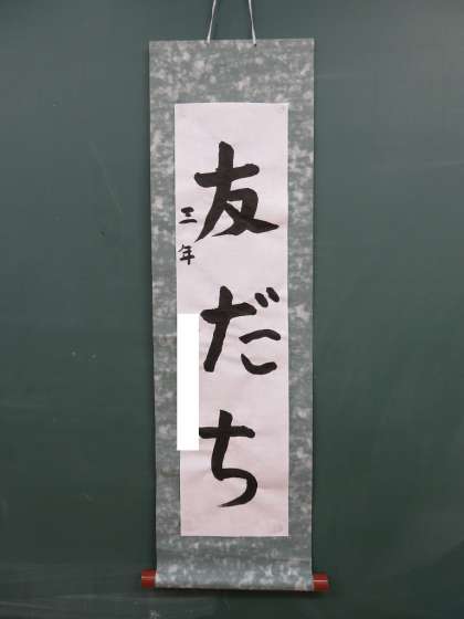 一昨日出来上がった書初めを仮まきに貼付け,掲示しました。