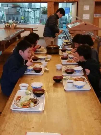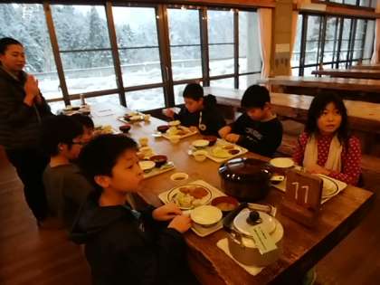 今日も完食の子どもたち。山の家での最後の夕食を大いに楽しみました。楽しくて会話もはずみ,だじゃれもとびかっています。