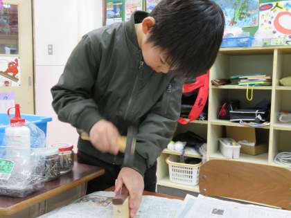 今日の図工で,釘打ちの練習などをしました。職人のような目で,木を切ったり釘を打ったりしていました。