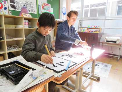 今日のFSさんは,チェコから日本に来られたトマーシュさんです。トマーシュさんは今日初めて静原校に来られ,「習字」を3年生と一緒に学習しました。