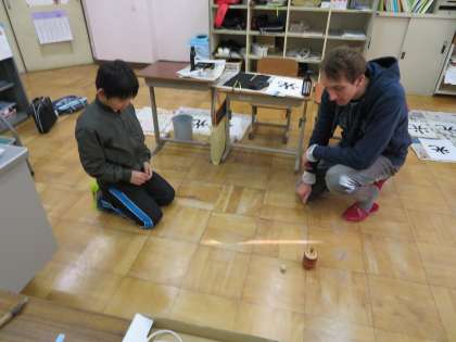 その後少し時間があったので,3年生が日本のコマの回し方を教えていました。