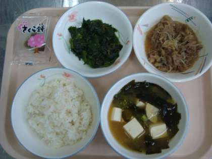 麦ごはん 牛丼(具) ほうれん草のおかか煮 春のみそ汁 桜もち