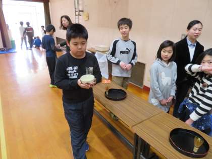 これまで,様々な場面でご協力いただいた方々へ,心をこめてお茶をたてて,ふるまいました。1年間の感謝の気持ちが伝わるよう,静原小学校のみんなで頑張りました。