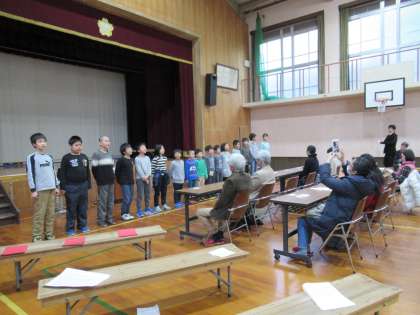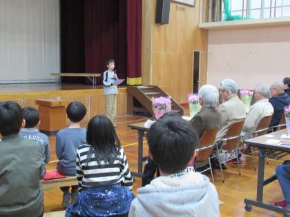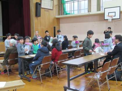感謝の会では,お礼の気持ちを込めて「未知という名の船に乗り」を児童全員で歌いました。それから,お花をプレゼントしました。このお花は,自分たちで作ったお米や商品を売った売上の一部を足して購入したものです。