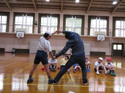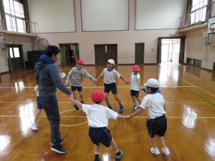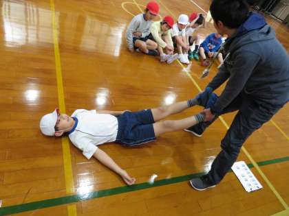 2回目の体育がありました。今日は2人一組になって,いろいろな体ほぐしの運動や,「あんたがたどこさ」の歌を歌いながらの運動,フラフープを使ってのキャッチなどを行いました。とても楽しく運動ができました。